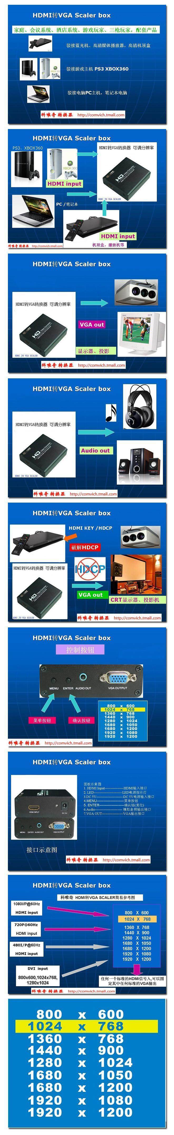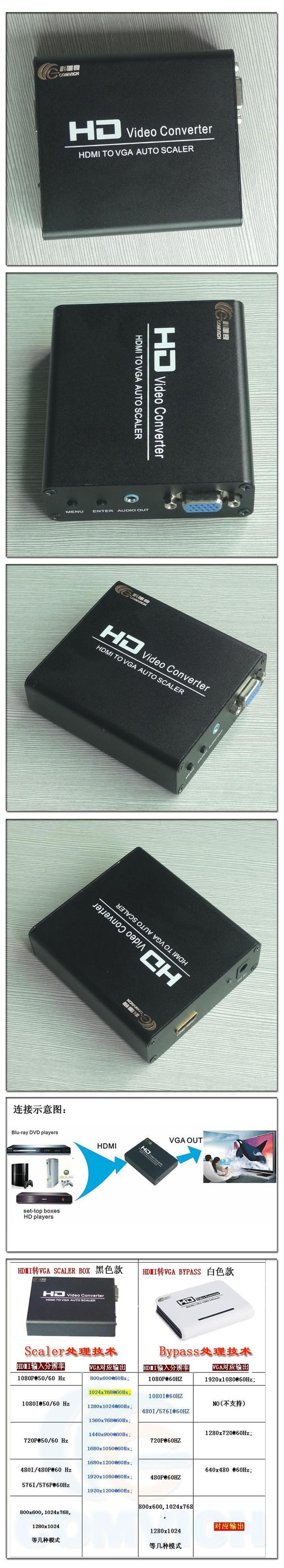 这款HDMI转VGA scaler转换器是可以将高清HDMI数字信号转换为VGA模拟信号及模拟音频信号的转换器,此款HDMI转VGA转换器,具有视频缩放功能,可以将HDMI的高清视频信号转成标准VESA格式的VGA信号;
