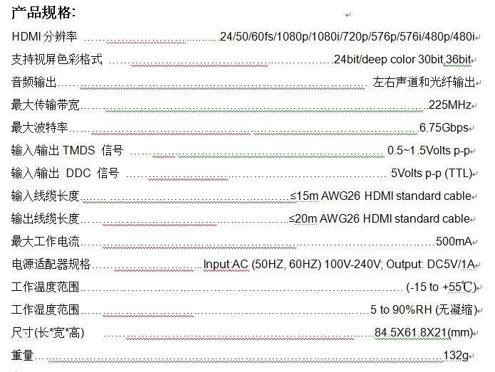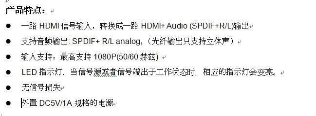 这台转换器可以把HDMI信号源连接到单个的HDMI显示设备并独立输出立体声+SPDIF信号输出,然后在支持HDMI输出的显示设备(如电视、投影仪)上播放。